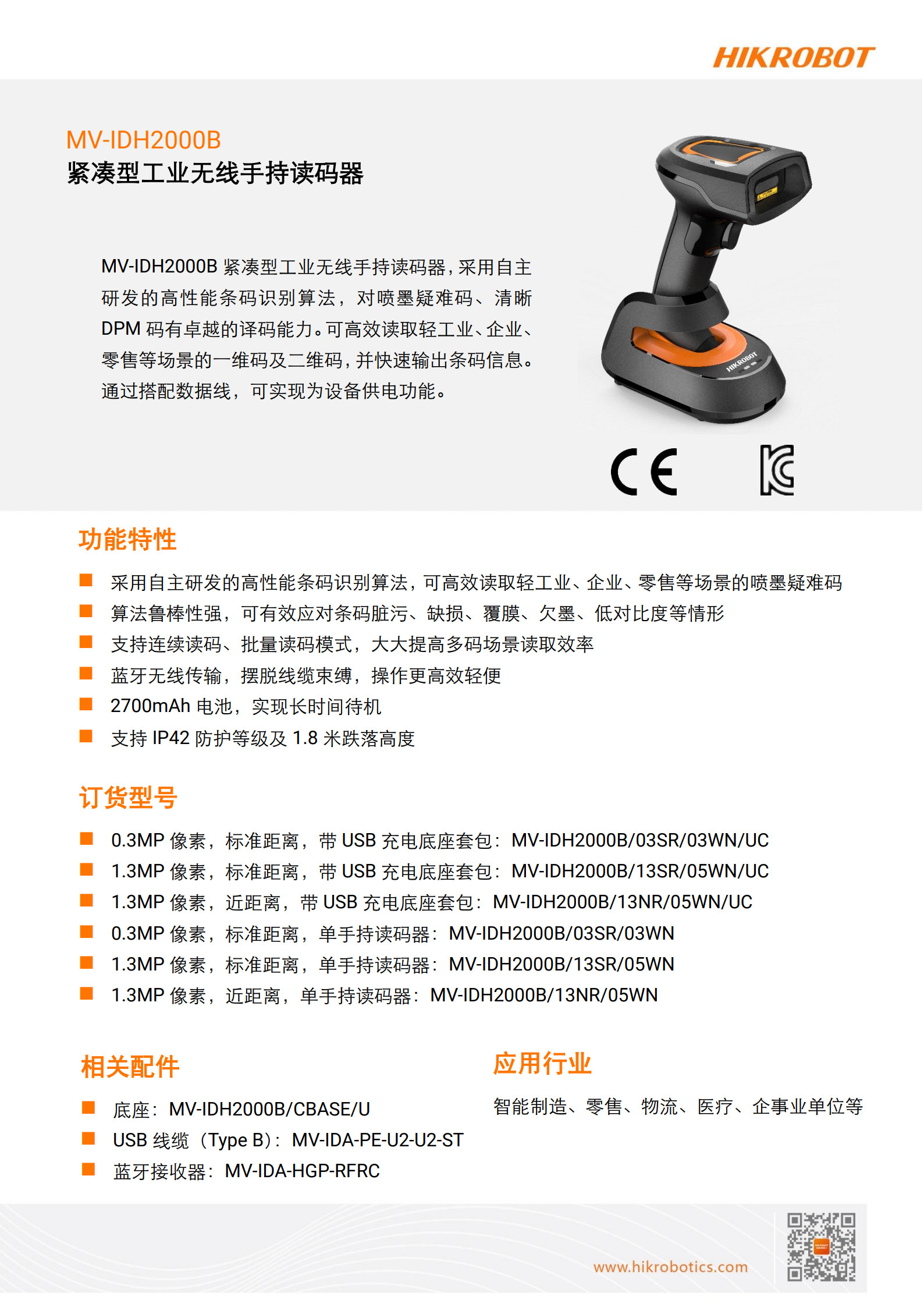 1.3MP 像素,近距离,单手持读码器:MV-IDH2000B/13NR/05WN