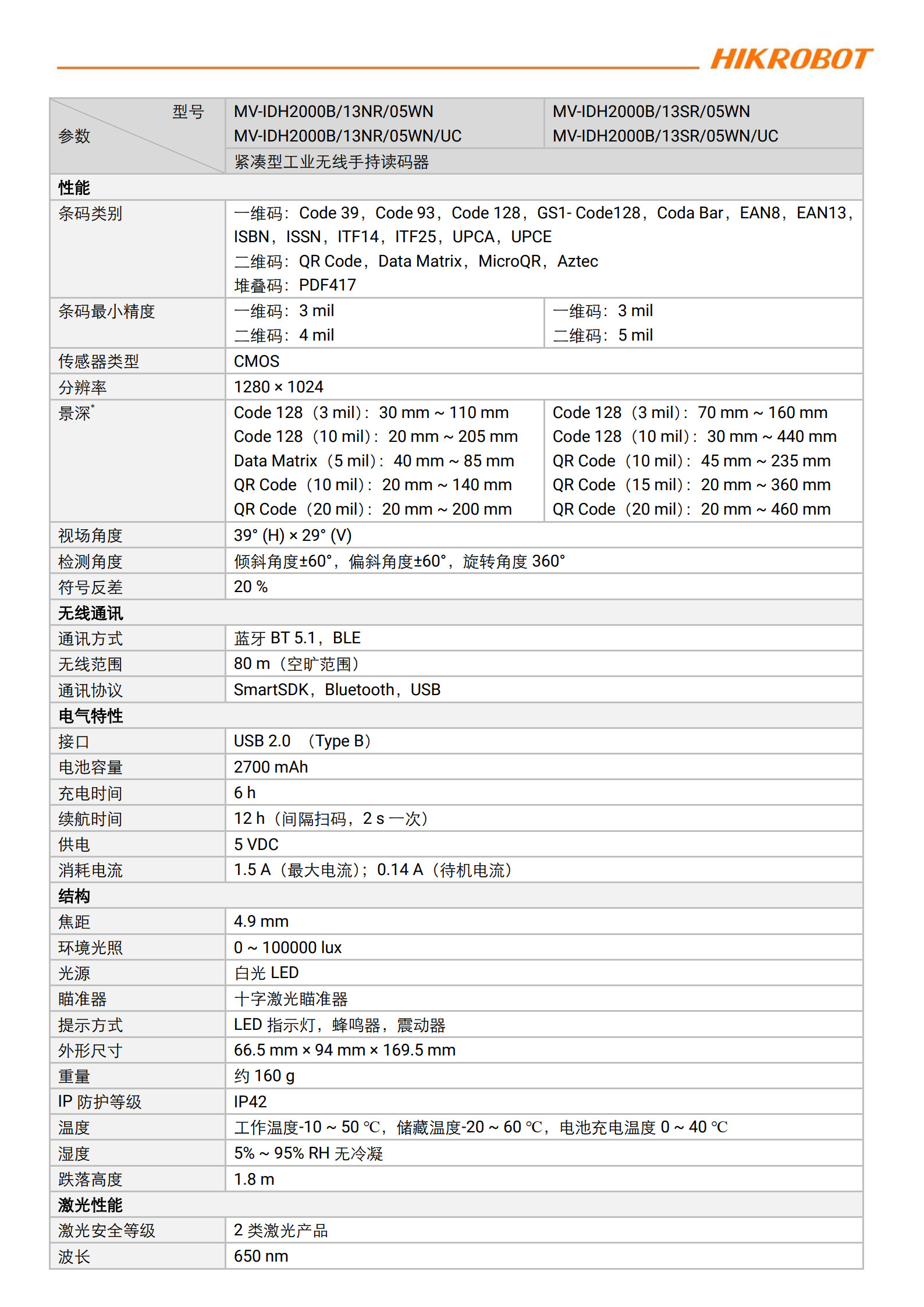 1.3MP 像素,标准距离,单手持读码器:MV-IDH2000B/13SR/05WN