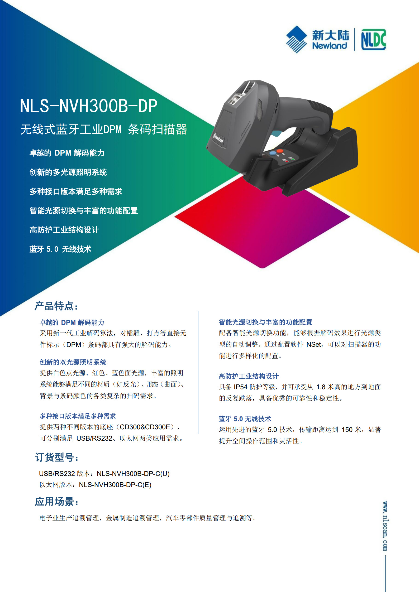 NLS-NVH300B工业无线手持条码扫描器,对镭雕、打点等直接元件标示(DPM)条码具有强大解码能力,提供白色点光源、红色面光源以及蓝色面光源,能够满足各种复杂的扫描需求。运用先进的蓝牙5.0技术,传输距离达到150米,显著提升空间操作范围和灵活性。